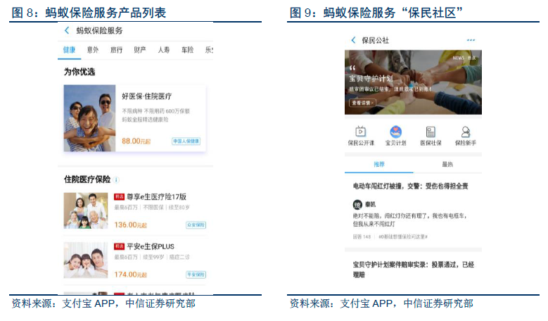 保险板块通过创设场景产品+搭建销售平台+技术开放,与保险公司互为开放生态。从前端销售看,蚂蚁包括场景保险和平台保险两大板块。其一发轫于淘宝平台的退运险,2015年9 月独立后,陆续开发了账户安全险、乐业险等险种。其二通过搭建销售渠道,配合保民公社,利用AI 技术实现保险教育。从后端流程改造看,蚂蚁通过数据建模助力保险公司产品创设、便捷理赔、个性化定价和精准营销。2017 年蚂蚁向行业开放“车险分”和“定损宝”,提供数据接口,保险公司同时可根据自身需求对数据进一步加工。截至2017 年3 月末,保险服务年活跃用户3.92 亿人,单用户保费同比增长43%。