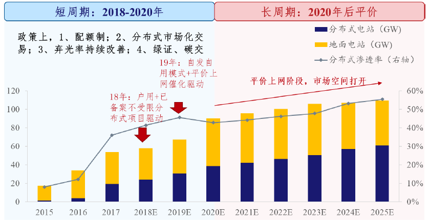 新补贴下自发自用模式兴起:17年底光伏标杆电价下调1毛钱,分布式度电补贴仅下降5分钱。新补贴政策下,部分省市“自发自用,余电上网”模式的电价已高于标杆电价,结合“隔墙售电”打通销售渠道,及不占国家指标等政策优惠,预计自发自用模式类似于户用市场,将大面积在我国终端市场铺开。
