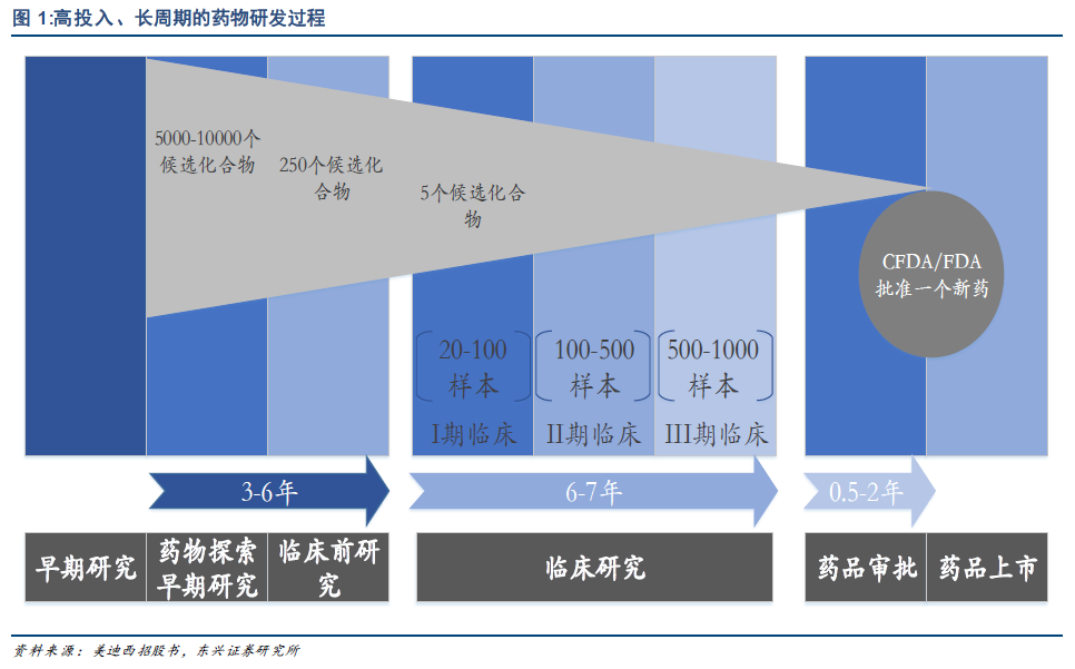 自二十一世纪初以来,疾病复杂程度的提升大大降低了各环节的研发效率,导致药物研发周期越来越长,制药企业药物研发的时间成本不断增加。美国制药企业的新药品种从实验室发现到进入市场平均需要10 至15 年时间,新药开发期的不断延长等同于其上市后享有的专利保护期缩短,对于销量大的明星药品,专利保护期的缩短意味着预期营业收入的大量减少。