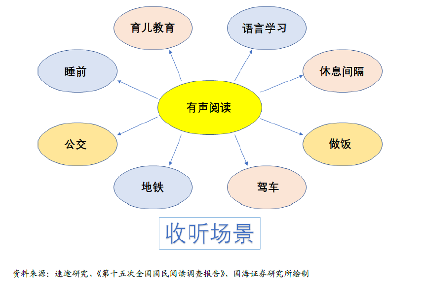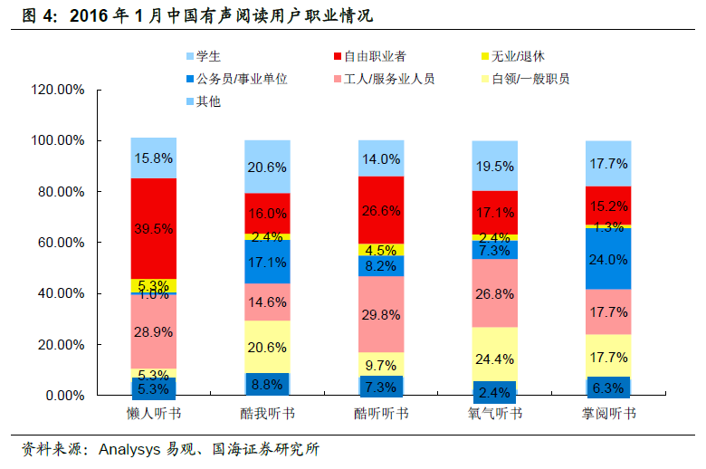 有声阅读市场用户特点:有声阅读市场用户以男性为主,用户年龄呈现年轻化趋势。根据Analysys 易观数据显示2016 年1 月在各个主要听书APP 中,男性用户的数量均超过50%,其中酷我听书男性用户占比达72.2%;用户年龄分布中30 岁以下用户人群数量均超过半数,其中懒人听书、酷我听书、氧气听书30 岁以下用户均接近70%。