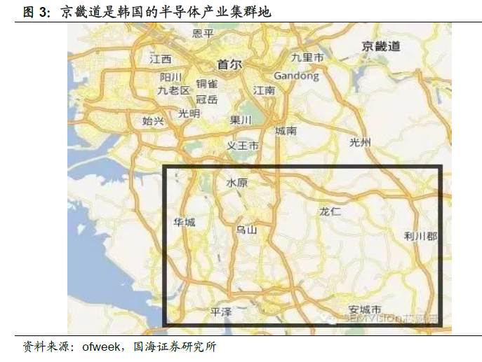 半导体上游材料等细分领域分工细致,产业集群效应明显。下游存储器产业的发达给韩国上游的材料、设备等细分领域带来了发展机遇。韩国的半导体产业分工明确,从设计,制造,加工,包装,运输等每一个环节都有非常细致的企业分工,以至于一家半导体厂周围往往聚集着为数众多的配套企业。这种层层外包的业务有5 级之多,甚至连简单的排线也都有专门的企业来做,由此发展出庞大的半导体产业链。根据韩国中小企业厅的数据,韩国在册的集成电路制造企业有三百多家,PCB 制造企业近两千家,半导体设备企业两千多家,半导体材料企业四千多家,其他电子部件企业一万多家,合计两万多家企业。地理上,大部分企业聚集在韩国的京畿道(道相当于国内的省)。三星电子的龙仁和华城晶圆生产基地、在建的平泽基地、再到SK 海力士利川基地,都位于京畿道。生产计基地周围密布着各种配套企业,因此类似于美国硅谷,水原、华城、龙仁、利川、平泽、安城等城市,形成了一个又一个的半导体产业基地。