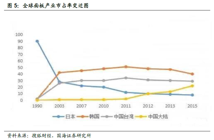 面板产业发展简史。与半导体行业类似,液晶技术的发明者是美国人,而将液晶技术广泛运用并且技术突破的又是日本人。液晶产业的“霸权”在不到60 年的时间里,先后从美国、日本、韩国到中国易主了四次。1962 年,当美国无线电公司研发出第一个液晶显示模型的时候,它们感到既兴奋又失望,兴奋的是一种全新的显示技术的诞生,失望的是这种显示技术似乎不如已经成熟的CRT(阴极射线管)技术,颜色单调,相应速度慢,尺寸太小,根本没办法运用于平板电视机。但是看到这一技术的日本人,对它产生了浓厚兴趣,并首先将其运用在了钟表行业,以及后来的计算器、仪器显示等领域,并最终运用于平板电视。在不断的研发生产-商品应用-技术突破的循环中,日本对液晶有了近乎疯狂的投入,到上世纪90 年代,日本企业几乎垄断了整个液晶市场。以夏普为代表的“液晶工匠”精神的企业,对液晶技术的研发作出了贡献。