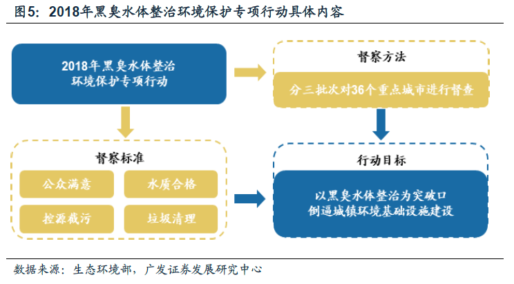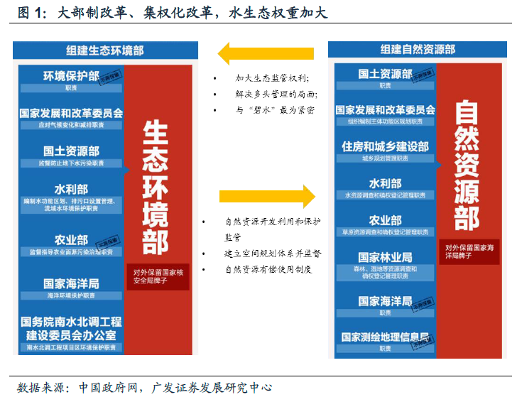 组建生态环境部,实现环境监管权统一,水生态的监管职能增强保障政策落实效率。2018年4月16日生态环境部正式揭牌,新部门生态环境监管职能强化、监管领域拓展。水生态职责方面:将国土资源部的监督防止地下水污染职责,水利部的编制水功能区划、排污口设置管理、流域水环境保护职责,农业部的监督指导农业面源污染治理职责,国家海洋局的海洋保护职责等整合至生态环境部。此次改革有望改变过去九龙治水、职责不清的旧貌,实现环境监管权统一,使得环保部门污染防治职责得到空前加强,将推动环保督查持续趋严和污染治理效率持续提升。