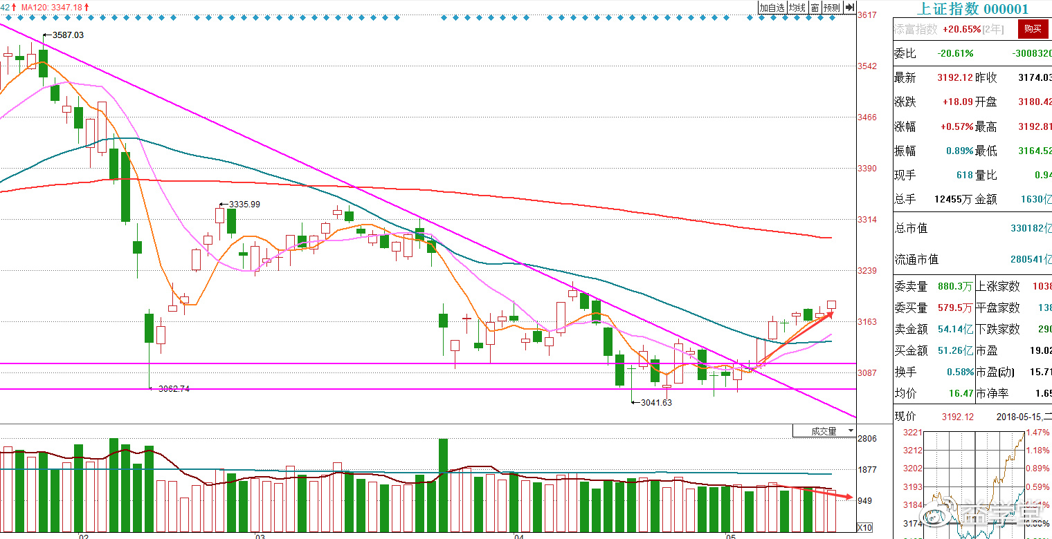 目前制约市场的主要原因在于成交量迟迟不放大,而且今天还是缩量上涨。指数重心不断上移,但近期各交易日量能却是在不断萎缩,出现量价背离,这对于后市走强可不是一个好的现象,而且指数上方也面临着前期高点以及缺口的压制。
