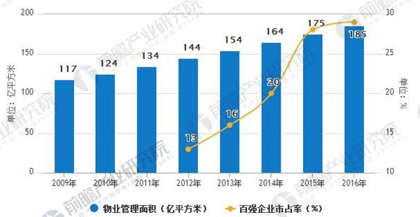 全国物业管理面积(亿平米)及百强企业市场占有率