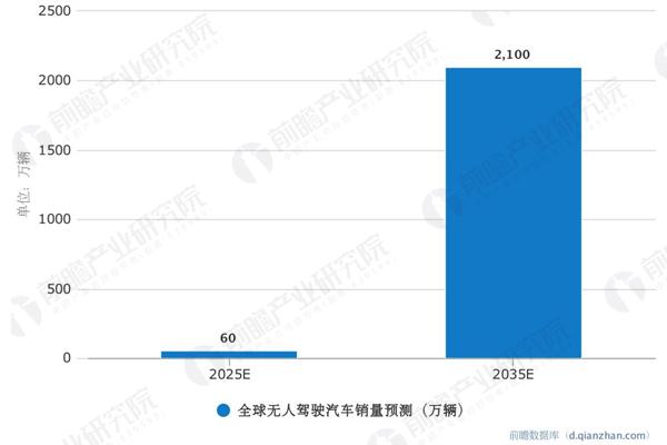 据前瞻产业研究院《中国无人驾驶汽车行业发展前景预测与投资战略规划分析报告》显示,无人驾驶汽车到2025年可以催生出一个 2000亿至 1.9 万亿美元的巨大市场。至2035年全球无人驾驶汽车销量将达到2100万辆,2025-2035年间年复合增长率为43%,届时中国将占据全球市场24%的份额。数据显示,2016年全球无人驾驶汽车市场规模为40亿美元左右,预计2021年全球市场规模将达到 70.3亿美元左右。