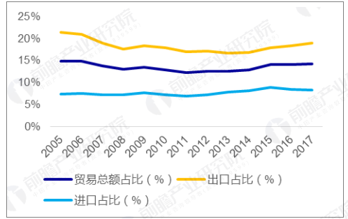 从贸易总量结构占比来看,中美互为对方的第一大贸易伙伴国,中美贸易在中国贸易总额中占比始终超过12%,出口和进口占比也都处于稳定水平,2017年分别为18.99%和8.36%。在全球化程度极高的当今,中美之间的贸易已经密不可分。