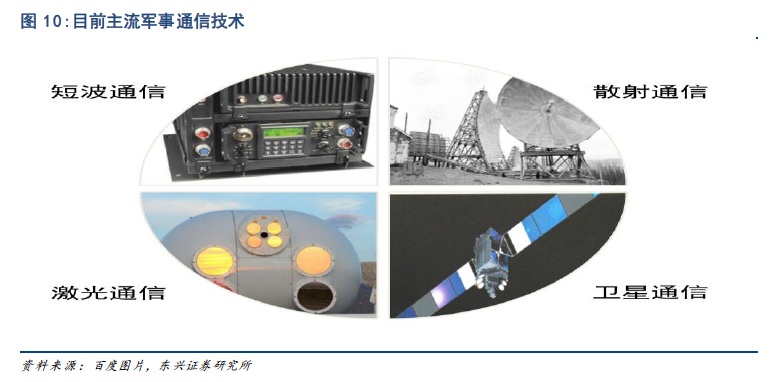 现代战争神经中枢,通信装备需求刚性。军事通信技术是指挥控制、体系化作战的基础,现代化的、完善的通信装备是国防信息化建设的重要内容。2009 年,在建国六十周年阅兵典礼上,通信兵首次亮相,从幕后走向台前。目前常用的通信手段包括:短波通信,主要依靠电离层的反射进行远距离通信;超短波通信,一般采用地波及空间波视距传输,用于战术分队近距离通信;散射通信,通过对流层对超短波频段能量的反射实现远距离通信,组网灵活,抗毁性强;卫星通信,为当下主流的军事通信技术,信息容量大、覆盖范围广;激光通信,包括光纤激光和无线激光两种,保密性好。