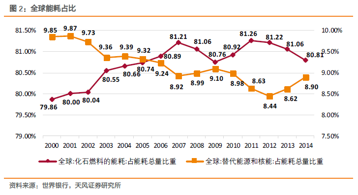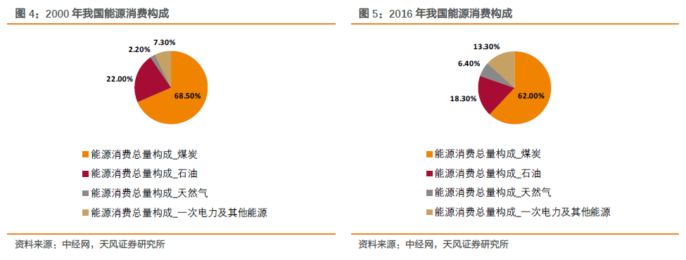 传统能源消费比重下降,清洁能源需求稳步增加。我国能源的消费需求正更多依赖可再生能源、天然气和电力,煤炭和石油需求则有所回落。截至2016 年,我国能源消费构成中,煤炭和石油占比已经从2000 年的90.5%下降至80.3%。根据国际能源署的预计,到2040 年,我国煤炭在总发电量中所占的比重将从2016 年的三分之二下降到40%以下,电力将在中国终端能源消费中占主导地位。