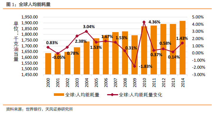 打造新经济结构,我国能源消费步入低增长。步入2000 年后,我国能源消费总量随着经济增长而逐步增加。随着近年来我国经济增速的放缓,能源消费总量的增速也迈入一个低增长的阶段。2004 年我国能源消费总量的增速高达16.84%,而在新政策情景下,我国的能源需求增长速度平均每年下降1%左右,2015 年达到最低的0.96%,不到自2000 年以来的年平均水平的六分之一。这是经济结构转变、强劲能源效率政策实施和人口变化所带来的综合效应。