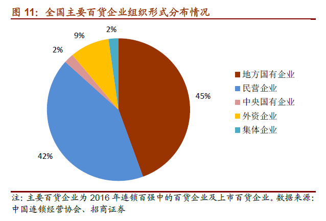 百货行业民营力量后军突起。改革开放后,随着民营和外资百货的设立,传统国营百货渐渐失去了竞争优势。各地政府开始纷纷对国营百货进行改革。在上世纪九十年代,以王府井百货为首的一批改制后的国营百货企业纷纷上市。根据2016 年连锁百强中百货企业的情况,我们做了上市公司与非上市公司的区分,数据显示大部分的主要百货企业已经上市,但仍有38%的企业尚未上市。