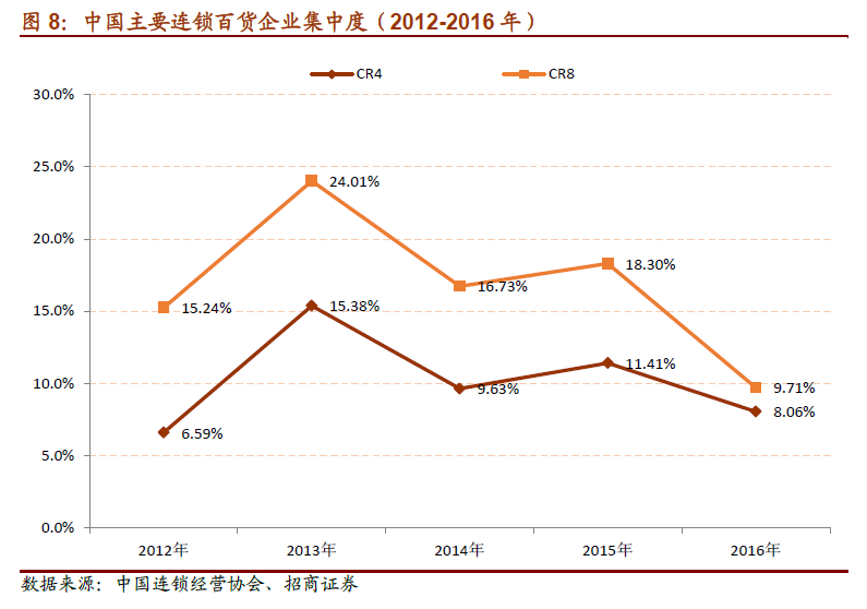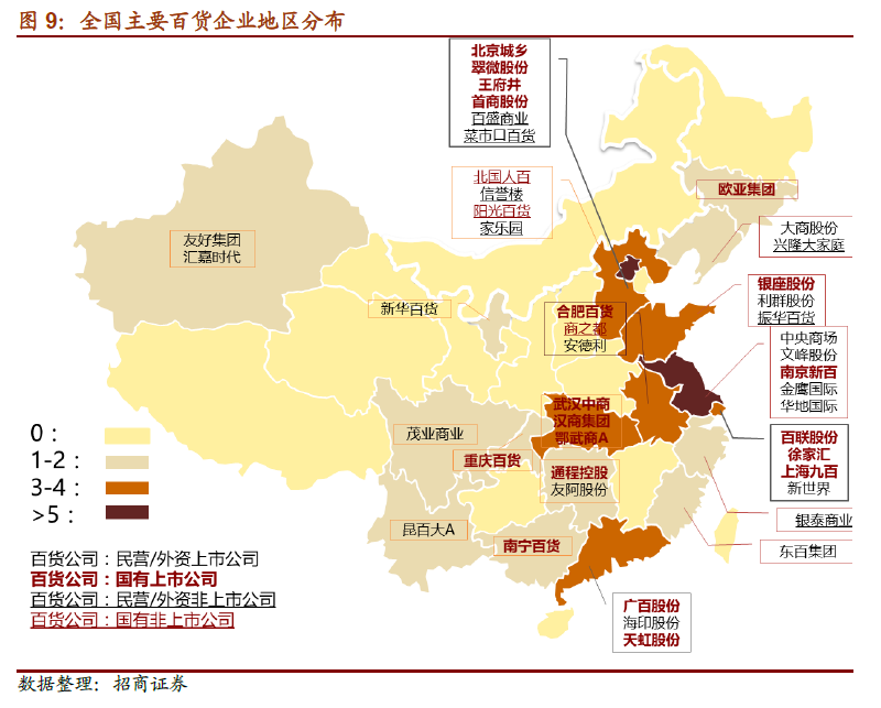 百货店布局分布区域性明显。我们根据中国连锁经营协会在2016 年公布的《2016 年中国连锁百强》中的百货企业,进行了地理分布的统计和展示。我国的百货企业总体分布呈现“全国分散,地区集中”的特点。尚未形成在全国层次规模、销售额等方面占绝对优势的全国性企业,各区域的百强连锁百货企业分布密度也有所不同,在经济较为发达的沿海省份分布密度较高,内陆省份相对较少。