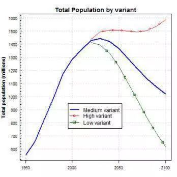 中国人口增长趋势预测,分为低生育率、中等生育率、高生育率三种方案,来源:联合国人口署