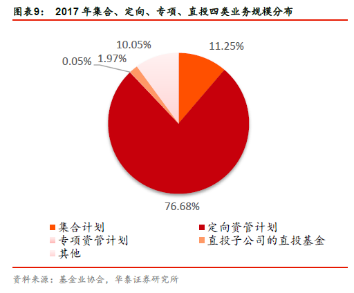 创新大会后券商资管产品可投资范围的显著扩容,增加了非标产品的投资区间,为此后通道业务的大发展奠定基础。券商资管实行以净资本为核心的监管指标体系,而信托开展同样业务对净资本消耗数倍于券商资管,因此券商资管相较于传统的信托通道成本更为低廉。对净资本的宽松要求使得券商资管得以通过价格战抢占通道业务市场,迅速做大规模。2012—2017 年券商资管AUM 从1.3 万亿元提升至16.9 万亿元,复合增速18%。集合资产规模从2014 年的0.66 万亿元提升至2.1 万亿元,定向资管规模从2014 年的7.3 万亿元提升至14.4 万亿元。