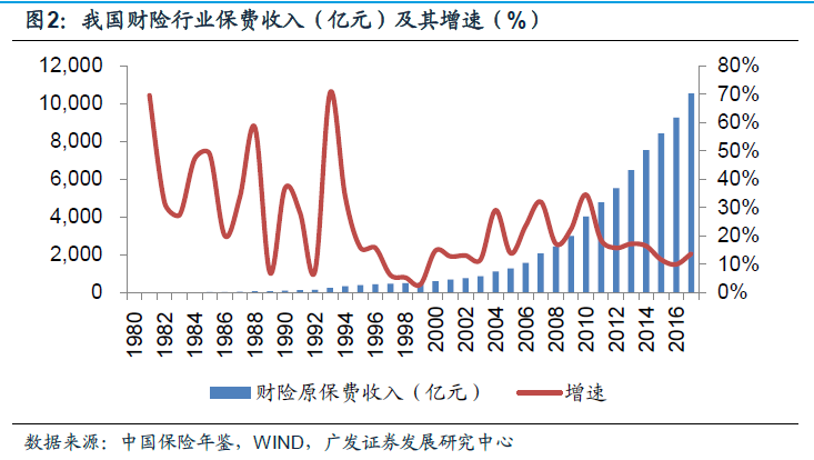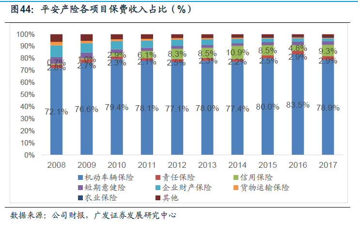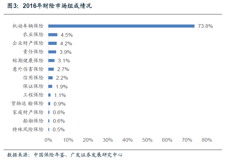 相较于车险,非车险在近年来发展更快。我国车险保费近10年复合增长率为17.9%,责任保险保费复合增长率为20.6%,信用保证保险复合增长率为23.68%。在近三年,车险保费复合增长率为10.16%,责任保险和农业保险复合增长率分别为20.1%与13.1%。可见财险行业主要的非车险保费增长速度大于车险保费增长速度。预计这个趋势会继续保持,车险占财险市场比例将持续降低。