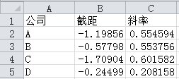 现有一csv文件,分别是四个公司名称,以及每个公司关于数量和工时的截距和斜率。