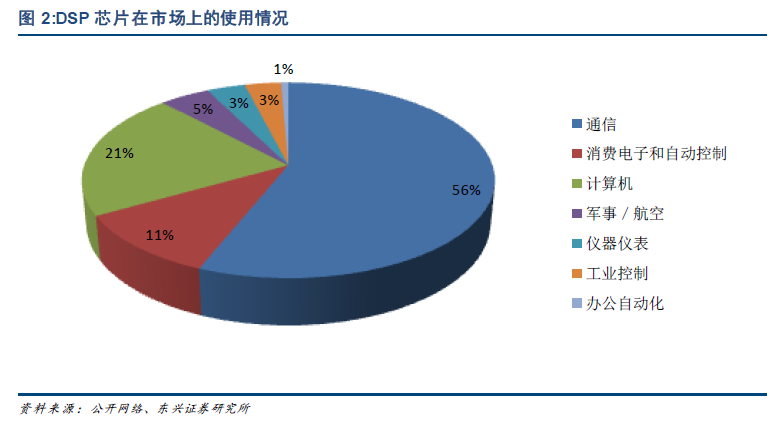 应用DSP 的领域较多,未来新应用领域有望层出不穷。根据美国的权威资讯公司统计,目前DSP 芯片在市场上应用最多的是通信领域,占56.1%;其次是计算机领域,占21.16%;消费电子和自动控制占10.69%;军事/航空占4.59%;仪器仪表占3.5%;工业控制占3.31%;办公自动化占0.65%。