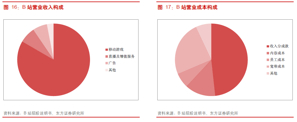 广告业务:收入1.6亿,占比6.5%。B站广告业务主要包括展示广告和节目内制广告。除了横幅(Banner)等展示广告外,B站与内容创作者、视频内容提供方合作为广告主提供节目内定制广告,以及18年推出信息流广告将带动广告收入提升。