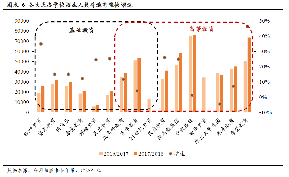 直观来看,主营业务收入可通过量和价拆分成学生数量和ARPU值。(1)从民办学校收入的“量”端来看,学生数量主要取决于学校数量和单校就读人数,而单校就读人数主要取决于学校容量和学校使用率。2017/2018学年中各大民办教育集团的招生总人数基本在2.0万至7.6万之间。学校数量方面,目前民办K12的学校数量在8所到80所之间不等,民办高教的学校数量则都在10所以内。民办高校主要通过收购新学校扩张规模,而民办K12的扩张模式轻资产和收购兼具,相比之下扩张能力更强。单校入读人数方面,民办高校的入读人数普遍在万人级别,民办K12的单校入读人数跨度较大,数量在几百至一万不等,其中国际K12学校以及幼儿园的入读人数较低,一般在千人以下;单校利用率方面,整体学校的利用率基本都在60%以上,其中民办高校基本在80%以上。(2)从民办学校收入的“价”端来看,ARPU值的主要来源为学生的学费和住宿费,其次包含一些如夏令营、游学、课外兴趣培训等配套服务收入。从教育集团整体的平均学费来看,专注民办基础教育阶段的平均学费在2万至4万之间,尤其是以国际K12教育为主的枫叶教育、海亮教育及博实乐,其平均学费在3万元以上,远高于其他学校;而从事高等教育的企业的平均学费水平基本上处在千元级别。而整体上增值服务收入规模较小且不确定,基础教育阶段的民办学校配套服务种类相对丰富。