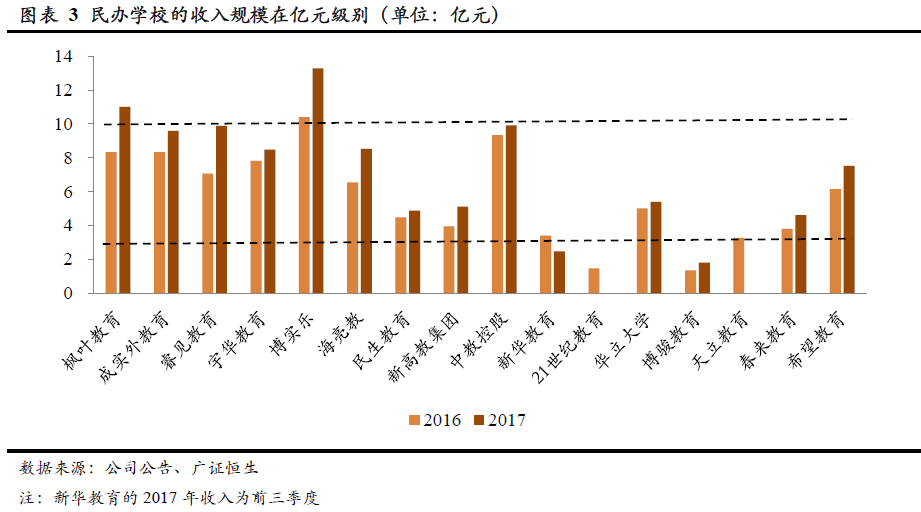 民办学校类资产收入规模均在亿元级别,博实乐和枫叶教育两家国际K12教育学校年收入超十亿元。从收入规模来看,各大上市公司最新报告期的收入均在3亿元以上,其中收入规模最大为美股市场的博实乐,2017年收入高达13.28亿;港股市场的枫叶教育2017年收入也超过了10亿元,这两家企业都是专注K12阶段国际双语学校的运营。从包含已递交聆讯材料的企业来看,民办学校类资产的整体收入规模也均在亿元级别,成实外教育、睿见教育、宇华教育、海亮教育、民生教育、新高教、华立大学、春来教育和希望教育的收入规模在3-10亿元之间,整体营收具备一定规模。
