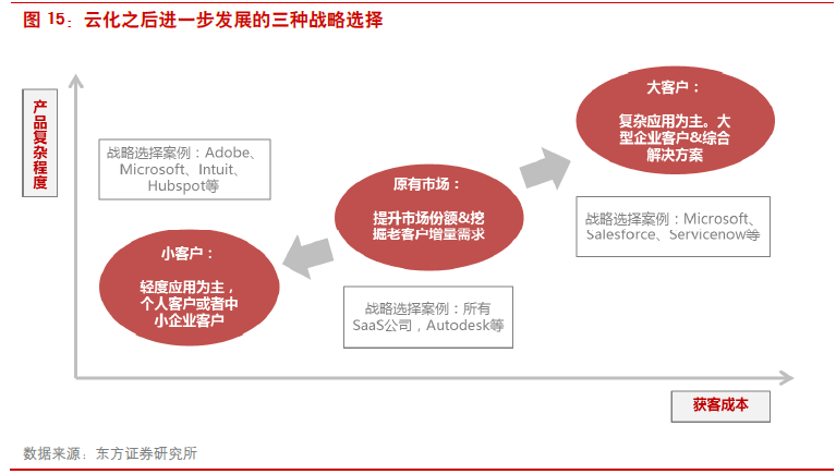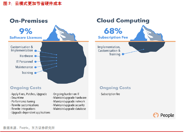 云化有利于提升市场规模。市场规模的提升来自于两方面:1>进一步挖掘市场需求。相比于传统软件,SaaS软件功能更强大、使用更便捷、网络效应强,且更容易深入到业务和交易环节,走向产业互联网,从挣“IT”的钱向挣“业务”的钱迈进。2>未来客户IT预算向SaaS集中。SaaS将数据库、服务器、存储、网络、运维等功能整合到订阅服务当中(由SaaS厂商购买IaaS或PaaS服务),向客户提供一体化的IT服务,客户不再需要单独购买基础软硬件,从而客户的IT预算向SaaS集中。3>有效防止盗版客户。SaaS云+端模式中,需要实施与服务器发生数据交换,有效防止盗版客户。