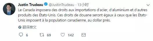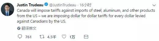 加拿大将对从美国进口的钢铁、铝和其他产品征收关税,美方对加国征收一元,我们也将对美方征税一元。