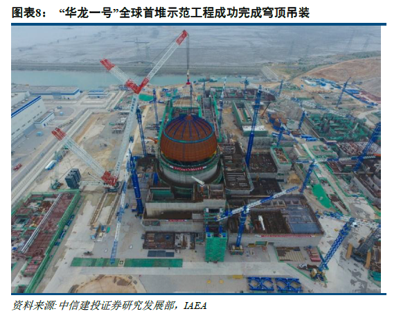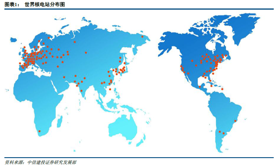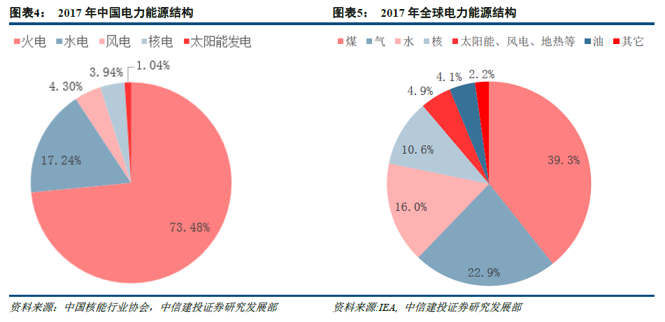 中国核电份额远低于世界平均水平。2017年1-12月全国累计发电量为62,758.20亿千瓦时 ,商运核电机组累计发电量为2,474.69亿千瓦时,约占全国累计发电量的3.94%,远落后于火电(73.48%)、水电(17.24%),清洁能源占比过小是目前中国能源结构的突出问题,过于依赖火电导致中国环境问题日趋严重,大力发展以核电为代表的清洁能源是解决中国环境问题的重要手段。可以预见,在国家政策的强力推动下,以核电为首的清洁能源的占比在未来5-10年将得到大幅提升。截至目前,世界在建核电机组数目为49台,其中中国在建核电机组数19台,居于世界各国之首。但是从2017年发电量占比来看,中国的核电占比(3.94%)远低于世界核电比例(10.6%),中国核电市场潜在空间巨大。