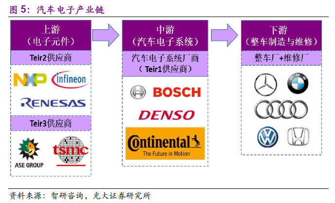 汽车电子产业链主要由3 个层级构成。(1)上游:电子元件供应商:包括车用半导体与IC 业者,代表厂商有恩智浦半导体(NXP)、瑞萨电子(Renesas)、英飞凌等。(2)中游:汽车电子系统厂商,代表厂商有博世、大陆、电装等。(3)下游:整车制造厂与维修厂,代表厂商有:奔驰、宝马、大众等。汽车电子行业内的AEC-Q100 标准和ISO-26262 标准对汽车电子的安全性和可靠性要求极高,厂商进入整车厂配套体系的认证周期约为2-3 年;汽车零件升级换代慢,周期约为5-6 年,认证和升级换代周期长、行业壁垒高导致汽车电子产业链格局稳定,市场集中度高,博世、大陆、电装等国际寡头占据大部分市场份额。