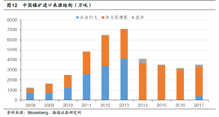 菲律宾的镍出口也出现瓶颈。2014-2016 年这三年的印尼“禁矿”期,菲律宾显然并未停止开矿的脚步,尤其在2013-14 年,很快取代印尼成为东南亚第一红土镍矿出口国,年出口量超过4000 万吨。但是从最近三年的出口量看,有明显下降的趋势,主要原因是矿产品位下降以及菲律宾政府对于环保问题日趋严苛。