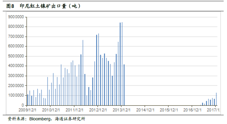 印尼出口数量和种类。在2014 年印尼禁止红土镍矿出口之前,印尼大量出口红土镍矿。至2013 年,达到顶峰6000 多万吨出口量。而在2014-16 年几乎没有出口量。2017 年放开出口,但是有出口配额和品位限制:品位必须在1.6%以下,目前出口配额达到3500 万吨。2017 年的整体出口量也不到500 万吨。