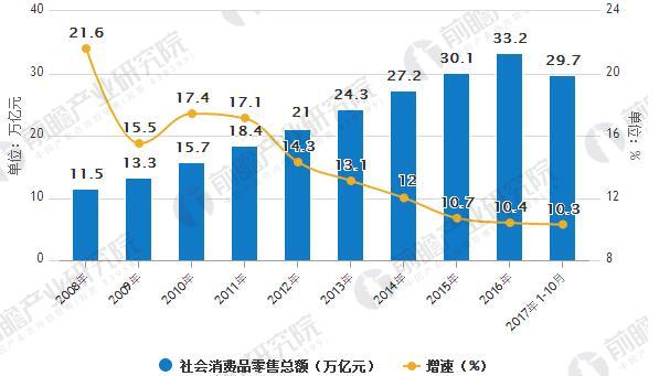2017 年 1-10 月,社会消费品零售总额累计29.74 万亿元,累计同比增长10.3%, 增速与上年持平;其中10 月份社会消费品零售总额3.42 万亿元,同比增长10.0%,增速与上年持平;社零数据 继续保持在10%左右的增长区间,延续震荡回升态势。2017 年1-10月,限额以上企业商品零售额累计11.07 万亿元,累计同比增长8.4%,增速较上年同期提高0.5pct;其中 2017 年1-10 月国内服装鞋帽、针、纺织品类实现累计零售额 1.19 万亿元,同比增长7.30%,增速较上年同期提高0.1pct。总体零售和服装行业零售情况稳中向好。
