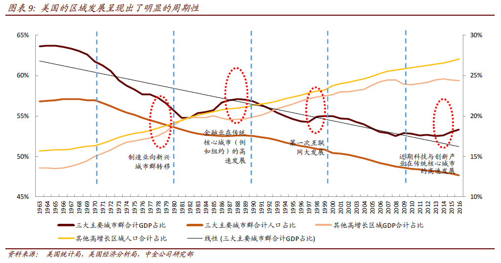 从国际经验来看,区域内经济发展的周期性主要由该区域内产业结构的变化所驱动。中短期来看,我们预计新兴城市群经济增长有望提速,主要得益于新兴城市群承接来自发达地区的制造业,使得制造业在这些地区进一步聚集。