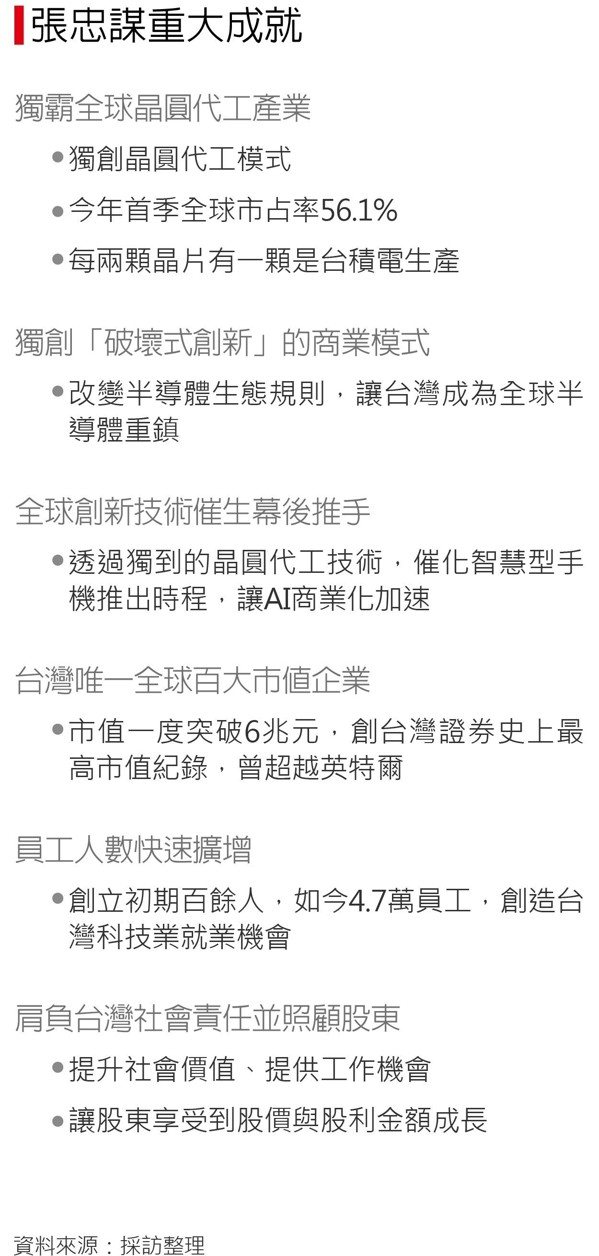 張忠謀1987年創辦台積電,把人生最精華的30多年都投注在台積電,屢屢創造科技業奇蹟,改寫半導體重要里程碑,創下無數世界級成就。