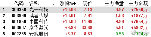 但盘中也不乏表现亮眼的一些热点题材涌现,调整依旧的知识产权概念股盘中全线爆发,龙头中国科传一字封涨停,京华激光、读者传媒、光一科技均封涨停。