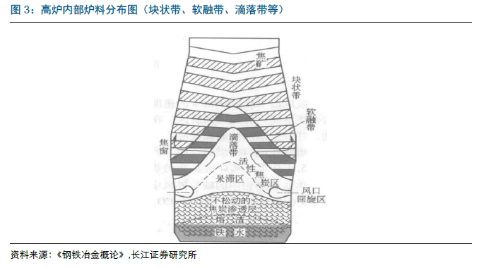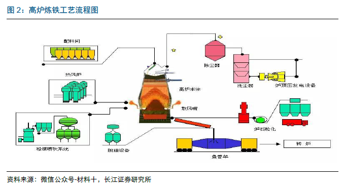 长流程是还原反应:将氧化铁还原成铁。长流程指的是高炉还原过程,将铁矿石(烧结球团等)与焦炭煤粉等从高炉炉顶装入,再以鼓风炉从高炉下端吹入高温热风,热风在向上流动过程中,经过传热、还原、熔化、脱碳作用,将铁氧化物还原成金属铁,从而实现Fe-O 分离。