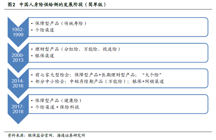 1992-1999 年:普通寿险(传统险),个险渠道崛起。1992 年,友邦保险设立上海分公司恢复在中国的业务,并将寿险代理人制度(个险渠道)引入国内,即公司招募外勤代理人并培训后,面向个人客户销售人身保险。个险代理人的增加显著扩大了人身险产品的覆盖面,迅速打开了市场。主要销售的产品变更为“普通寿险”——两全保险、终身寿险、定期寿险等“保障型产品”,产品保额大幅提升至万元级别,缴费方式从月缴变为年缴,保险期间大幅拉长,出现了终身寿险产品。