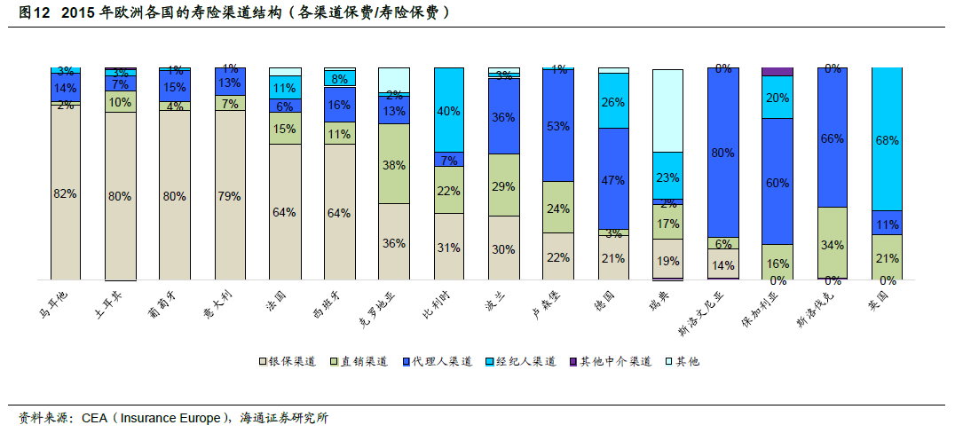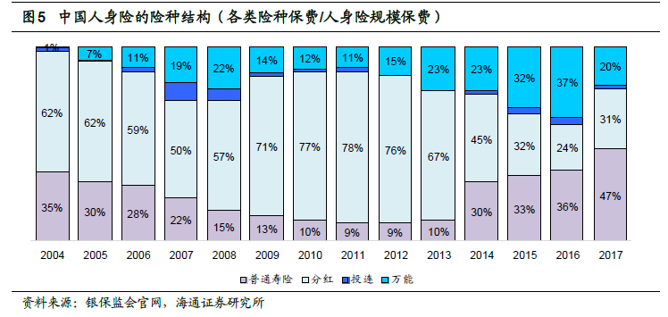 2000-2013 年:新型寿险(分红险、万能险、投连险),银保渠道高速增长。1996-1999 年央行多次下调存款利率,当时寿险公司销售的高预定利率保单造成了巨额利差损。作为应对措施,1999 年6 月10 日保监会发布《关于调整寿险保单预定利率的紧急通知》,将寿险保单的预定利率调整为不超过年复利2.5%。费率管制下的传统险对于客户的吸引力大幅下降,这带来了分红险、万能险、投连险等新型保险(能给客户额外的利益分配)的发展良机,1999 年平安推出首款投连险,2000 年国寿推出首款分红险,2000 年太保推出首款万能险。2000-2013 年,分红险和万能险的保费占比显著上升,尤其是分红险占比最高接近了80%。而投连险(独立账户;风险由客户承担)仅在2007 年占比达到9%的高点,其他时期占比极小,并且由于销售误导(如夸大投资收益率),在2002 年和2008 年发生了两次投连险群体性退保风波。新型保险常被称为“理财型保险”,保障功能较弱(分红型终身寿险除外),且缴费方式常为趸缴或短期期缴,NBV Margin 显著低于保障型产品(传统险为主)。