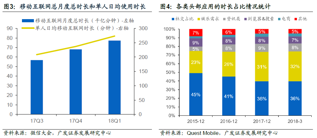 从行业来说,中国的整体移动互联网人均单日使用时长已经较高水平。根据QuestMobile数据,18Q1中国移动互联网的月度总时长达到了77千亿分钟,环比17Q4增长了14%,单人日均使用时长达到了273分钟,环比17Q4增长了15%。