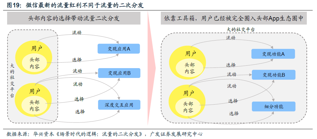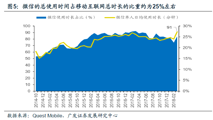移动互联网取代PC互联网的过程中,微信成为了新的流量枢纽和中心。在微信诞生的7年之后,这款社交App已经毫无疑问成为了移动互联网的中心,根据Quest Mobile的统计,微信单人的日均使用时长高达90分钟左右,而按照总时长的口径计算,移动互联网有25%的时长花在了微信上。