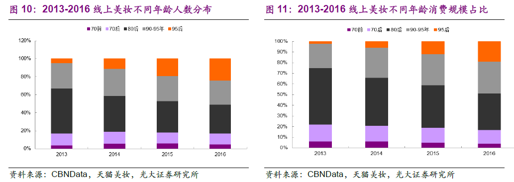 消费人群代际切换是推动行业发展最重要因素,社会中坚力量80 后及个性90 后撑起8 成线上化妆品市场。在化妆品消费者中:(1)88%核心受众为18-35 岁的80、90 后的社会主人群;(2)90 年后出生的年轻消费人群在2016 年线上消费人数占比已过半,且消费规模首次超越80 后人群;(3)95 后消费人群人数增长更为迅猛,占比接近四分之一,线上消费规模增速连续三年保持3 位数增长。