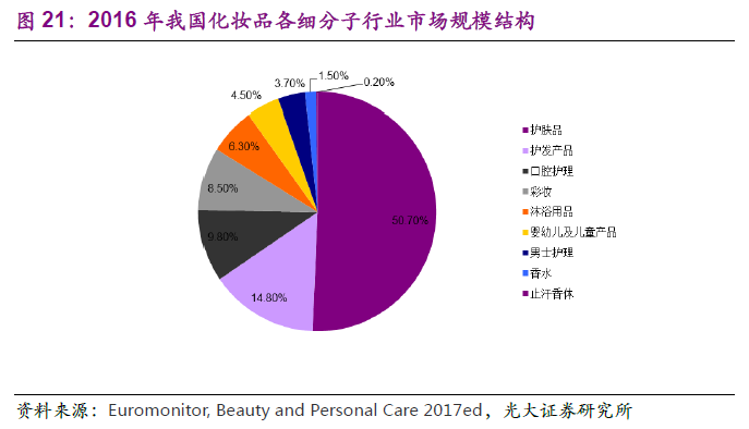 化妆品消费显著回暖,领跑其他消费品类。(1)从限额以上消费品各行业来看,2018 年4 月份化妆品类零售额累计同比增速达到15.90%,增速最高,领跑其他消费品类;(2)2017 年限额以上化妆品行业全年零售额达到2171 亿元,同比增长16.66%,增速为2013 年以来新高,高于同期消费品社零增速(+7.56%);(3)化妆品消费占社销零售总额比重持续提升,2017 年占比达到1.64%(+0.13pcts);(4)从整体零售口径统计来看,根据InMobi 发布的《2017 化妆品行业移动营销洞察报告》,2016 年中国化妆品零售整体交易规模达到了5830 亿元,增长率达到20.4%,预计到2018年,这一规模将超过8000 亿元。