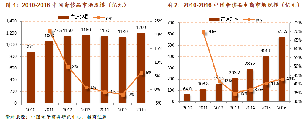国内奢侈品市场强劲复苏,奢侈品电商市场增速回升,加之综合性电商纷纷入局,奢侈品电商再度迎来风口。伴随着三公消费影响的减弱和消费升级,中国奢侈品市场在2016年强劲复苏。数据上,2016 年中国奢侈品市场规模为1200 亿元,同比增长6%,突破前期峰值。自2013 年奢侈品电商市场增速持续上升,至2016 年中国奢侈品电商市场规模达573.5 亿元,同比增长43%。同时,17 年6 月京东3.97 亿美元注资Farfetch,17 年8 月天猫奢侈品频道Luxury Pavilion,奢侈品品牌Cucci 在中国推出在线旗舰店,奢侈品集团LVMH 上线电商,都标志着奢侈品电商市场再度迎来风口。
