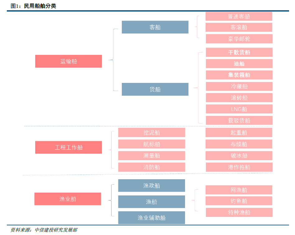 民用船舶按照用途分可分为运输船、工程工作船、渔业船等。运输船又可分为客船和货船,货船主要包括干散货船、油船、集装箱船、冷藏船、滚装船、LNG 船、载驳货船等,客船可分为普通客船、客滚船、豪华邮轮等。工程工作用船分为挖泥船、起重船、航标船、布缆船、测量船、破冰船、消防船、港作拖船等等。渔业船分为渔政船、渔船、渔业辅助船等。其中,应用最广泛、商业船队中吨位占比最大的是运输船中的干散货船、油船和集装箱船,这三种船型也被成为三大主流船型。