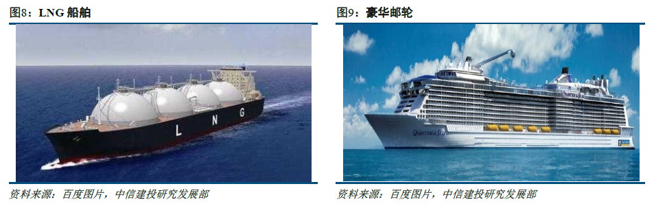 目前我国已经具备除豪华邮轮以外几乎所有船型的建造能力。民用船舶按照航行区域还可以分为海船和内河船;按照动力装置可以分为蒸汽动力船、柴油机船、燃气轮机船、核动力船、综合电力推进船等。目前我国已经具备除豪华邮轮以外的几乎全部船型的建造能力。从船舶制造企业的角度来看,一般船企将船舶分为三大主流船型和特殊船型两大类,三大主流船型即为前文提到的干散货船、油船和集装箱船,三大主流船型交付量较大,特殊船型指LNG 船、挖泥船等除了三大主流船型以外的船舶,特殊船型需求量相较三大主流船型小很多。目前我们国家还没有完工交付的豪华邮轮,但是骨干船厂已经开始涉足豪华邮轮建造领域,部分企业豪华邮轮建造项目已经进入落地实施阶段,如中船集团联合嘉年华集团等组建的邮轮船东运营合资公司将向中船集团与芬坎蒂尼合资组建的邮轮建造公司下单,订造2 艘Vista 级大型邮轮等。