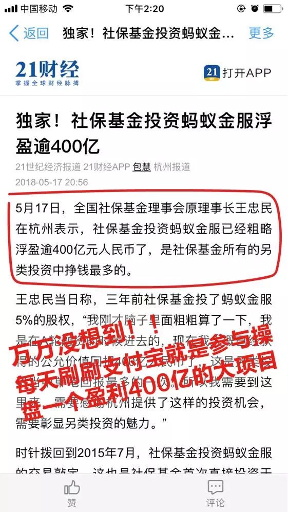 5月初,全国社保基金理事会原理事长王忠民就公开喊话,社保基金投资蚂蚁金服已经浮盈超过400亿元,蚂蚁是社保基金所有投资中收益最大,挣钱最多的!大家都知道,全国社保基金就是掌握着全国老百姓的养老钱,投资蚂蚁金服狂赚400亿,相当于已经给每个中国人多挣了30多块。