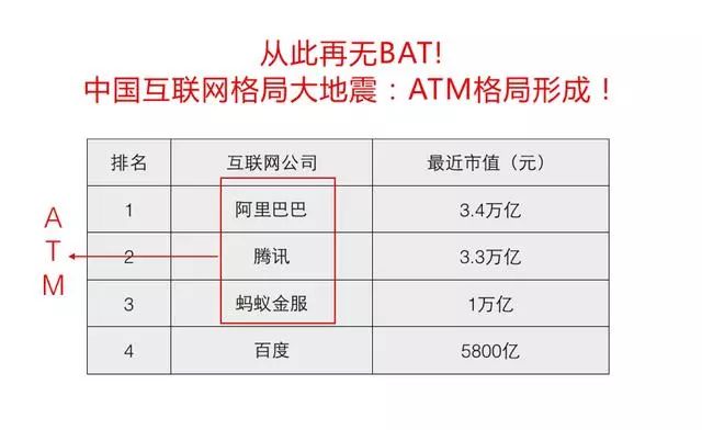 意味着从此再无BAT!互联网行业格局已经正式改写,百度走下互联网三巨头神坛,正式交棒给蚂蚁金服,ATM时代正式来临!蚂蚁金服的估值已经逼近两个百度的体量。