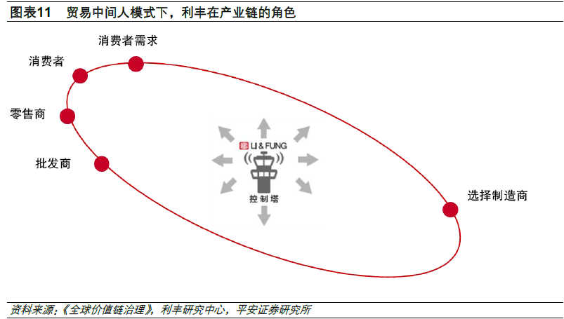 第一阶段:贸易中间人。利丰在成立初期,主要充当供应商和客户之间的中间人角色。1906 年冯柏燎先生和合伙人创办利丰时,在外资洋行几乎垄断对华贸易的情冴下,凭借其语言沟通能力的优势开拓属于自己的一片天地。这一阶段,利丰在价值链中参与的活动较少,仅仅根据客户的要求寻找合适的供应商,起到信息中介的作用。利丰的盈利来源为撮合买卖双方收取的佣金,幵不承担买卖双方合同的风险。
