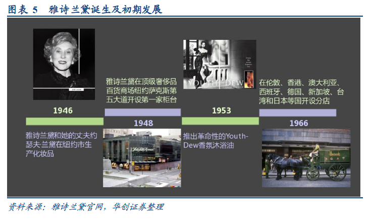 雅诗兰黛的诞生和初期发展与欧莱雅有所不同。欧莱雅靠产品研发起家,辅以渠道开拓,而雅诗兰黛则是在推出基础产品的基础上凭借其创始人出色的营销能力牢牢把握高端渠道。雅诗兰黛创始于1946 年,当时雅诗兰黛和丈夫约瑟夫兰黛在纽约市生产化妆品。开始时他们只生产四种基础产品:卸妆油、润肤露、万用特润霜和面膜,但就是靠着这四种产品,雅诗兰黛决定向高端化妆品市场迈进。1948 年,雅诗兰黛说服顶级奢侈品百货商场之一的纽约萨克斯第五大道让她开设了第一家柜台,自此雅诗兰黛便牢牢把握住高端渠道,将自己塑造为高端品牌。这么做的原因是雅诗兰黛将其主流用户定位于当时的上流贵妇群体,只有将产品打造得足够高端、奢华,其高额的定价才容易被目标群体接受。