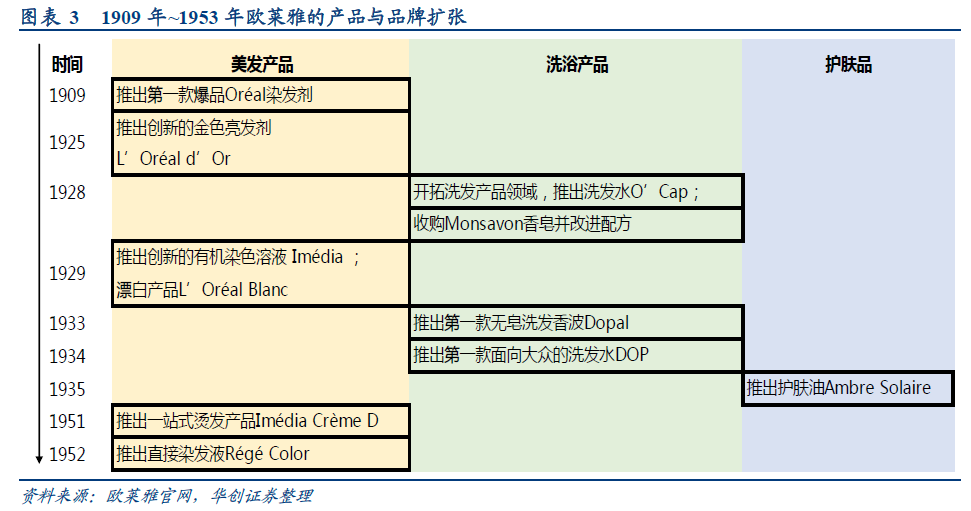 拓展品类,引领化妆品消费潮流。在经营方面,舒莱尔很早就意识到开拓除美发产品外其他领域的重要性,并始终跟随甚至引领着社会需求。1928 年欧莱雅迈向洗发领域,当时洗发产品落后、不便捷,但人们对于个人卫生护理的需求又日益增加,于是欧莱雅大胆发布了不用水即可起泡的洗发水O’Cap,该产品便捷舒适的特性再次征服了消费者。1933 年欧莱雅通过研发自制,推出第一款无皂洗发香波Dopal,其对毛发十分温和且使用方便,再次获得成功;1934 年再次创新推出第一款面向大众的“现代”洗发水,成为法国家庭卫生护理的新方式。Dop 畅销法国各地。1935 年女性获得更大的解放,开始显露更多的肌肤,日光浴后的褐色皮肤成为健康的标志和时尚风潮,为顺应新趋势舒莱尔开发出护肤油Ambre Solaire,并在法国首个带薪假期的前夕发布,这款产品成为一个时代开端的象征。