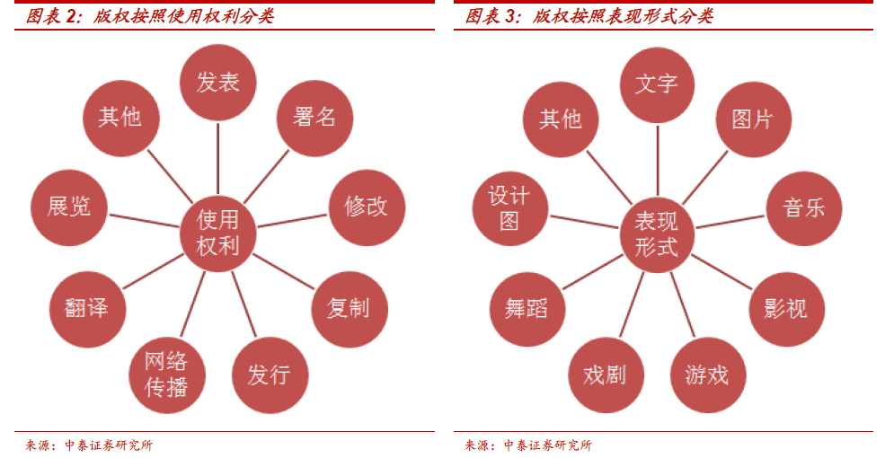 版权可根据使用权利及表现形式进行分类。根据权利可分为发表权、署名权、修改权、复制权等;根据表现形式可分为文字作品、影视、游戏、音乐等。本篇报告主要按表现形式分类,重点分析图片及影视版权市场。